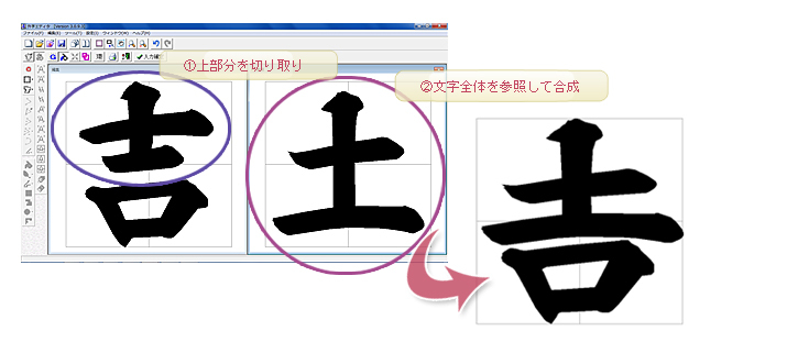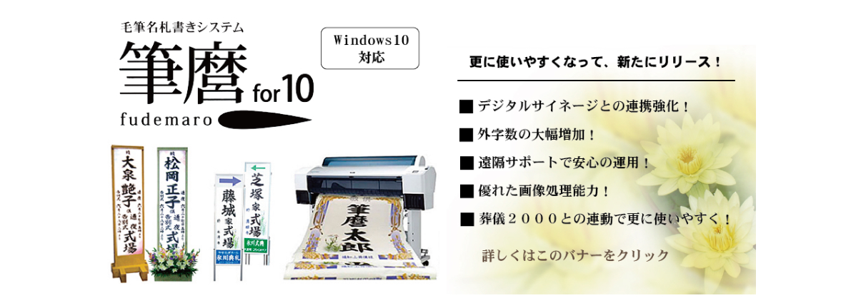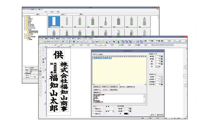 「外字エディタ」という文字編集機能が標準装備されています。 この機能を利用すれば、文字の一部を切り取ったり、他の文字の部分をあわせて合成したりという操作が簡単にできますので、どのような文字でも作成が可能です。 また、家紋についても文字と同様に編集できますので、喪家様の家紋が一般的でない場合にもご要望にお応えすることができます。 ※『筆麿for10』用として販売している毛筆書体には、JIS基準文字以外の俗字・当て字・旧字・変体かな・各種記号などが基本外字として登録されています。 書体によって登録外字数は異なりますが、1500~4000文字が登録されています。 ※会社のロゴなどBitmap・Jpegデータをアウトライン化して外字として利用することも可能です。