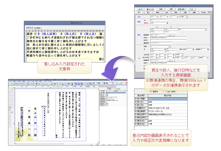 直接文字を入力するのではなく、故人名や葬儀日時などの情報を文章内に差込み設定が可能な文章枠の入力画面に差込内容を表示する機能を追加しました。