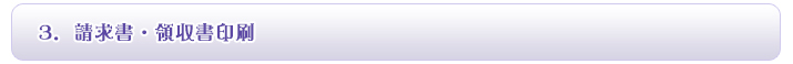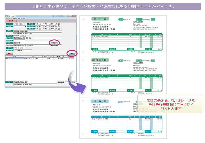 印刷した生花供物データから領収書・請求書の伝票を印刷することができます。 届け先の喪家名、生花供物の名称や金額、札名を参照して入力できるので、札と伝票の重複入力が無くなり間違いなく簡単に伝票入力を行うことができます。