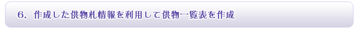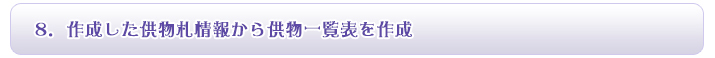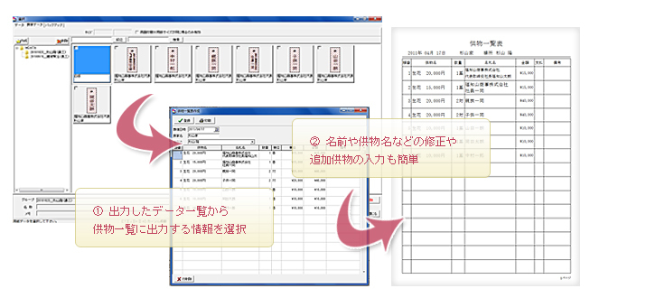 出力した札データを利用して、供物一覧表を簡単に作成できる「供物一覧表作成」機能が標準装備されています。