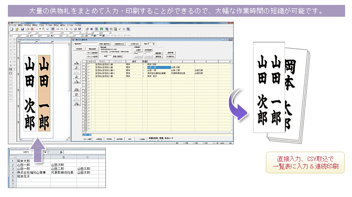 表形式の画面で、お名前・会社名・役職名などの札名文字を一覧入力した後、該当する札パターンに自動引き当てを行います。